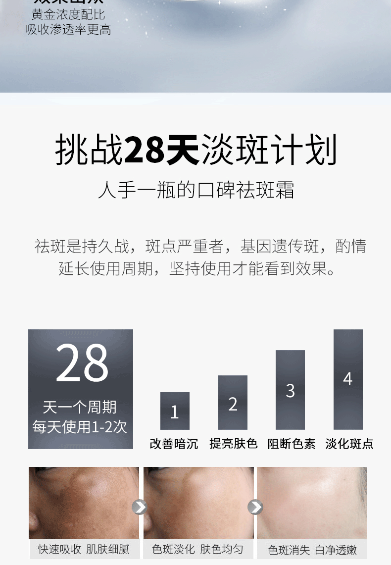 【產(chǎn)品功效】:革新專利原料,蘊(yùn)含肌肽,九肽高活性肽,靶向結(jié)合黑色素信號,沉默黑色素,玉白肽同時(shí)接收黑色素,雙重保護(hù)肌膚。