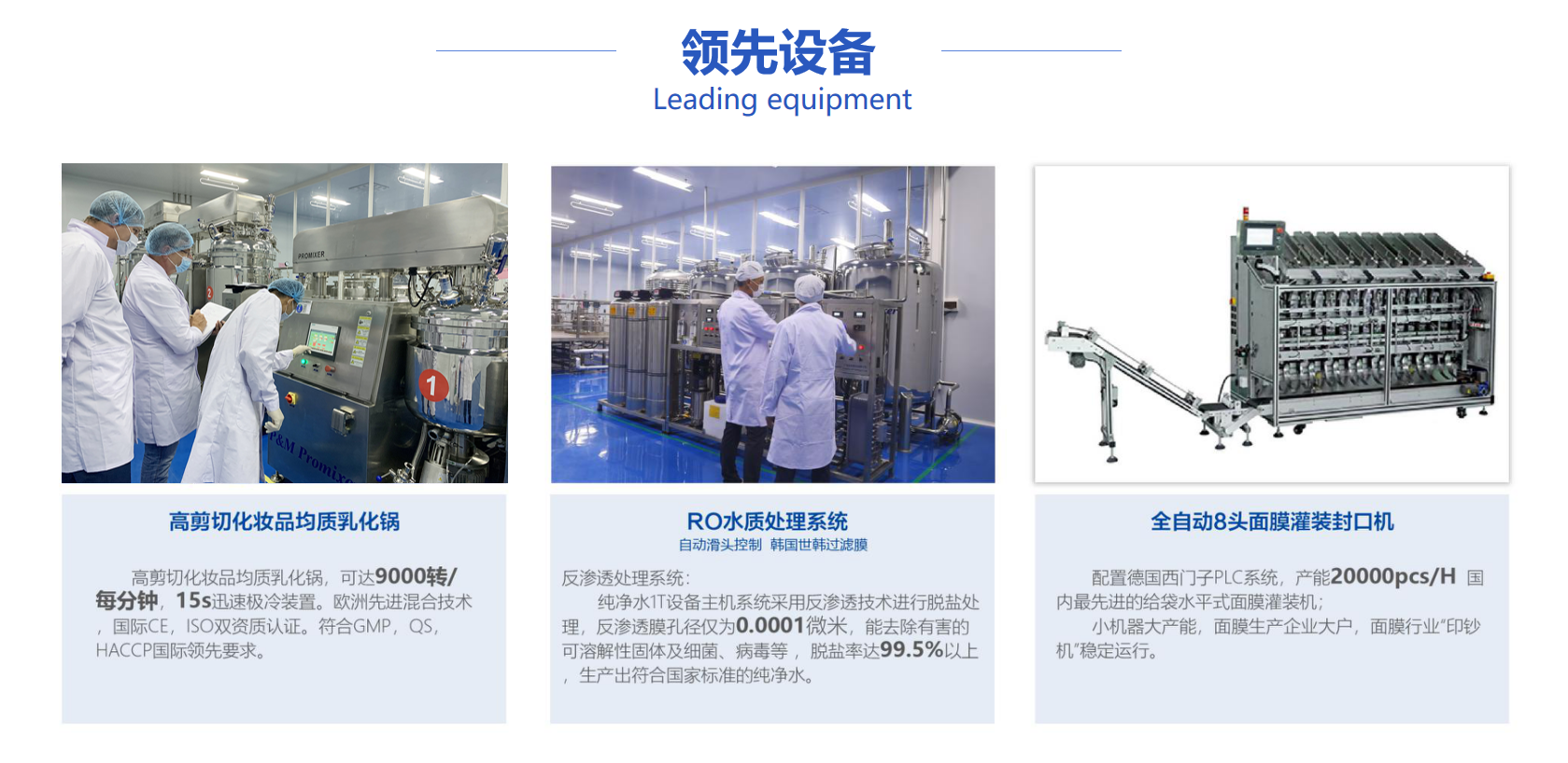 1、生產(chǎn)基地占地面積近20000平方米,設(shè)有低溫?zé)o菌封閉式研發(fā)室,十萬級(jí)GMPC生產(chǎn)車間和多條國(guó)際先進(jìn)的化妝品生產(chǎn)線,已通過ISO/GMPC/FDA等國(guó)際認(rèn)證。
