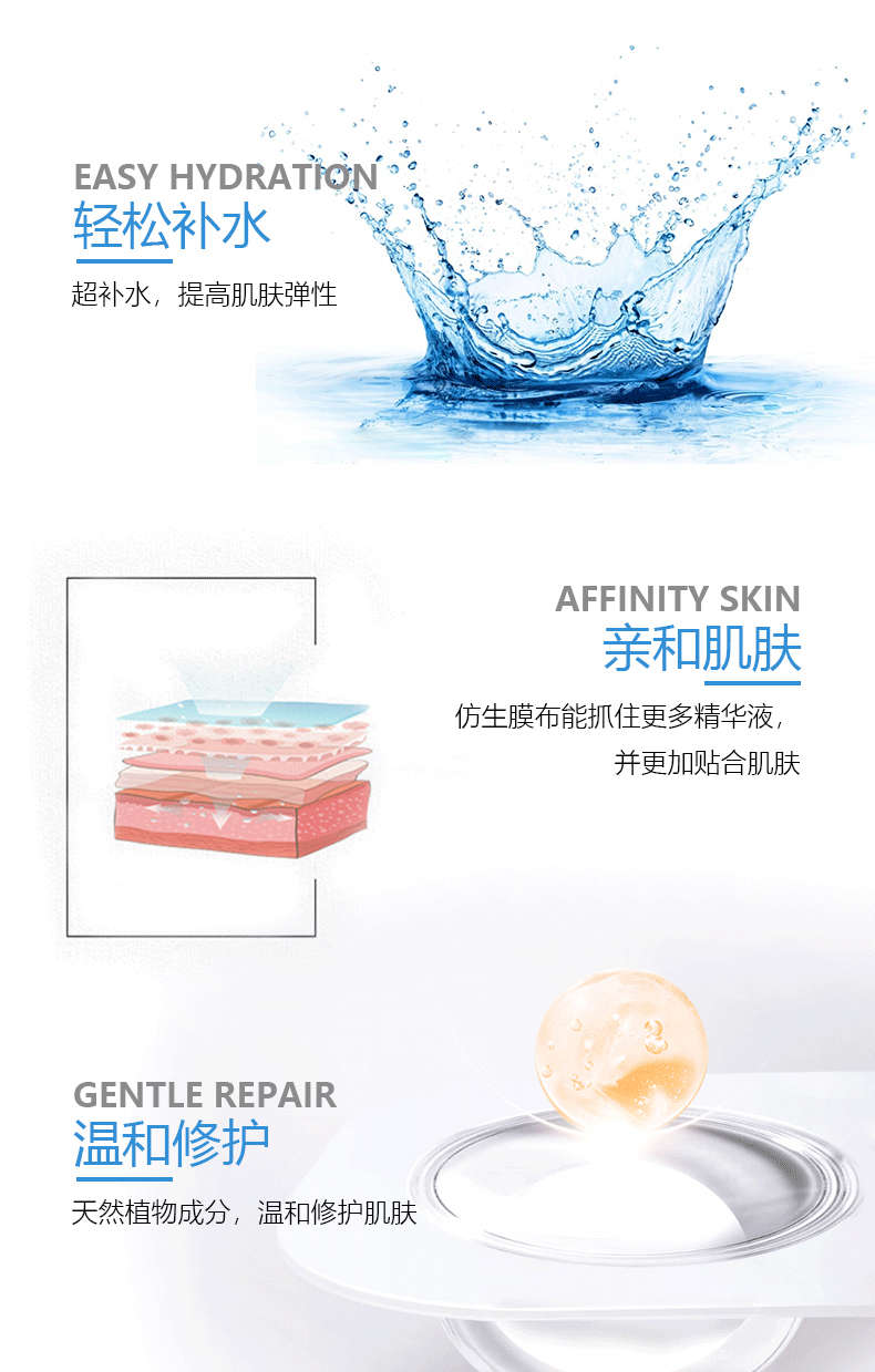 【產(chǎn)品功效】:富含多種氨基酸,微量元素,滿足肌膚所需,深潤肌底,將豐沛精粹原液與肌膚所必須的多種營養(yǎng)導(dǎo)入肌底,層層滲透,源源釋放濃萃活性成分, 深度激活久違的肌底澎湃原生力!潔膚后,取出面膜,將面膜布貼于整個面部,靜待15—20分鐘,由下而上揭下,輕輕按摩至精華吸收。