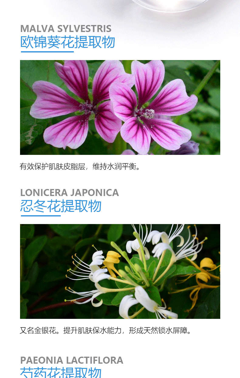 【產(chǎn)品成分】:歐錦葵(MALVA SYLVESTRIS)花提取物、忍冬(LONICERA JAPONICA)花提取物、芍藥(PAEONIA LACTIFLORA)根提取物