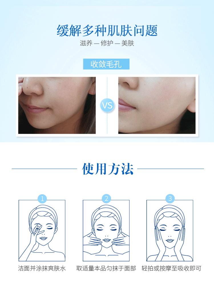 使用方法:使用爽膚后,取本品適量于掌心,沿肌膚紋理方向,均勻涂抹于面部,輕輕按摩至吸收。