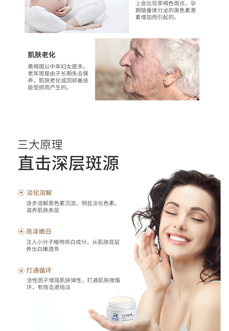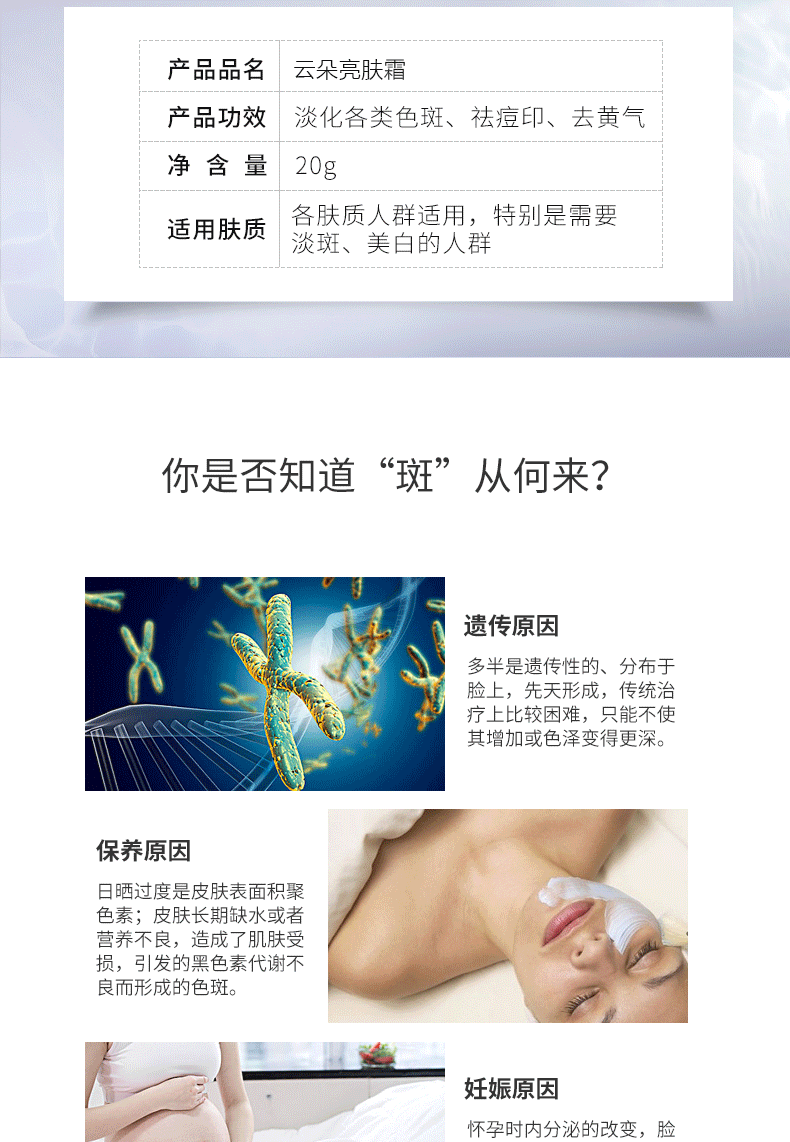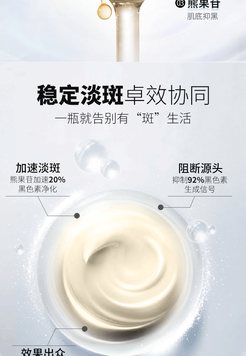 【產(chǎn)品功效】:革新專利原料,蘊(yùn)含肌肽,九肽高活性肽,靶向結(jié)合黑色素信號,沉默黑色素,玉白肽同時(shí)接收黑色素,雙重保護(hù)肌膚。